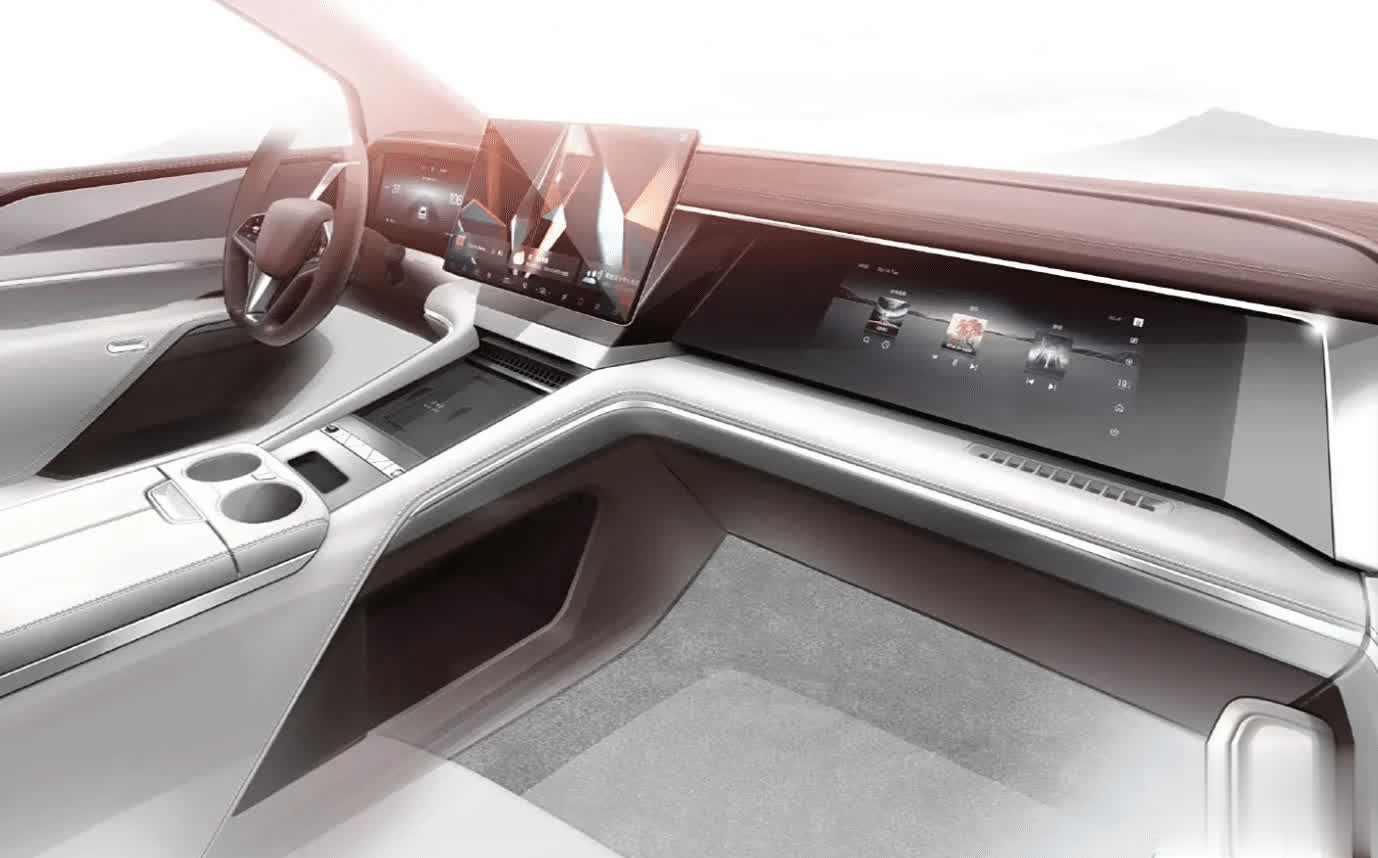 虽然目前这款车还没有公布实车的具体内饰方案,但是近日官方也给出了设计师设计手稿,大概可以看出整个中控台面的风格,将会采用三大屏的布局,当然主要还是凸显中控悬浮车机大屏幕,而且看样子这块屏幕还是支持自适应旋转。副驾驶一侧有单独的娱乐面板,预计高配版本的后排也将提供车顶折叠大电视。